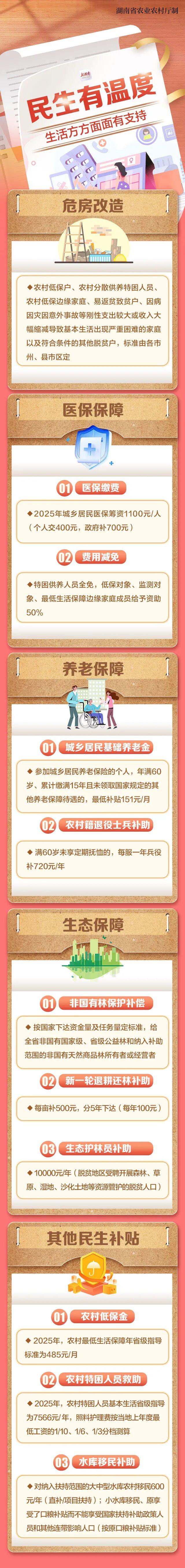 农业保险政策覆盖水稻、油菜、玉米、能繁母猪、育肥猪等十余个种类,为农业生产提供风险保障。农机购置与应用补贴一般为机具市场销售价的30%,支持农业机械化发展。民生保障有温度。2025年农村最低生活保障省级指导标准为485元每月,农村特困人员基本生活省级指导标准为7566元每年;社会散居孤儿基本生活费最低保障标准提高到1200元每月,集中供养孤儿标准提高到1700元每月,困难残疾人生活补贴和重度残疾人护理补贴省级指导标准均提高到每人每月100元。