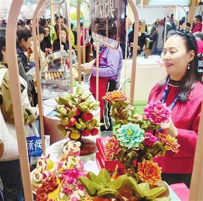 “这花开得如此鲜艳,怎么养出来的?”在杨氏花馍展台前,东丽区非物质文化遗产代表性项目“杨氏传统花馍制作技艺”代表性传承人杨恩芳笑着对围观的市民说:“您来摸摸这朵‘花’,它是面做的!”的确,若不是仔细观察,很难一眼看出桌上摆放的“花开富贵”“柿柿如意”“苹苹安安”等一盆盆栩栩如生的“绿植”,竟是巧手捏出来的花馍。